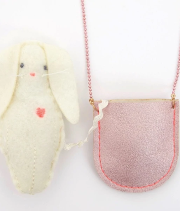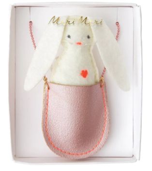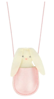 This adorable necklace is perfect as an Easter or springtime gift. It features a cute padded felt bunny in a glittery pink pocket, and is hung with a pretty pink bead chain.