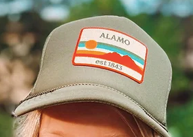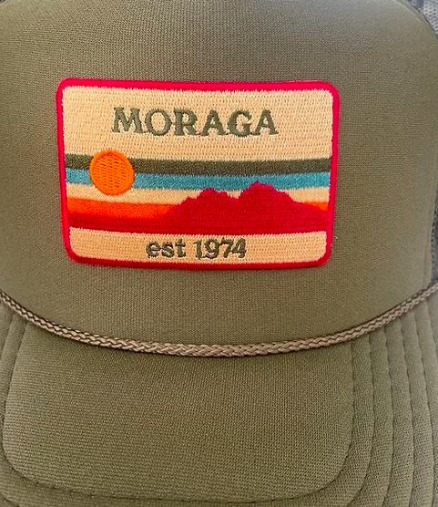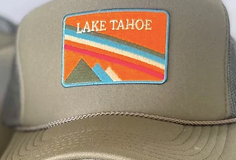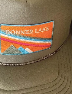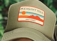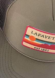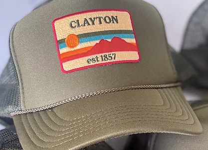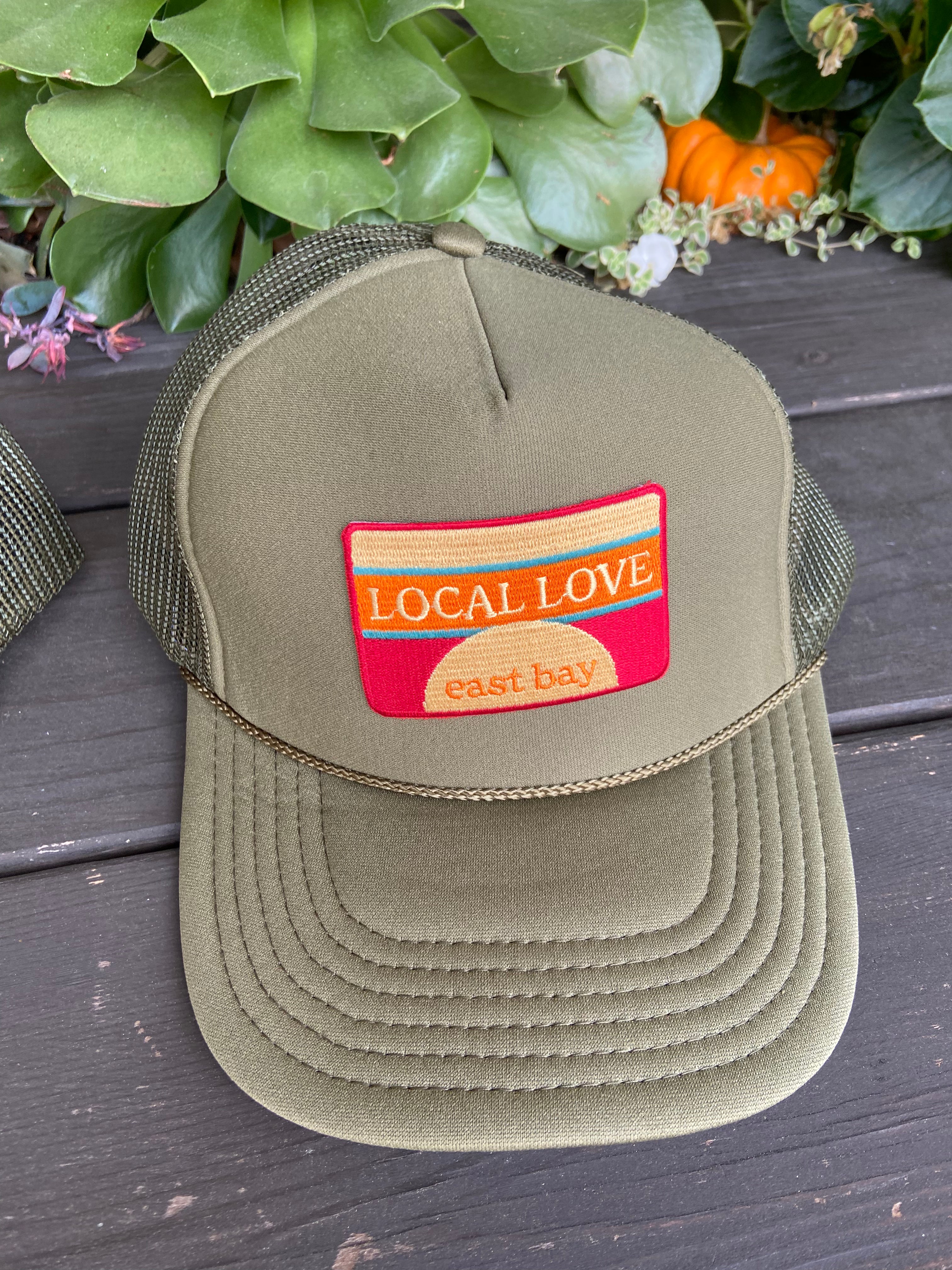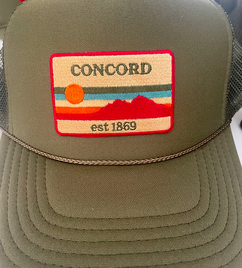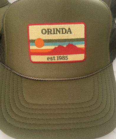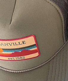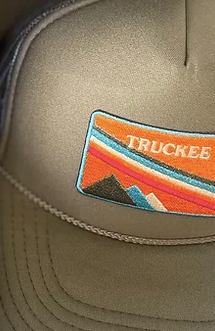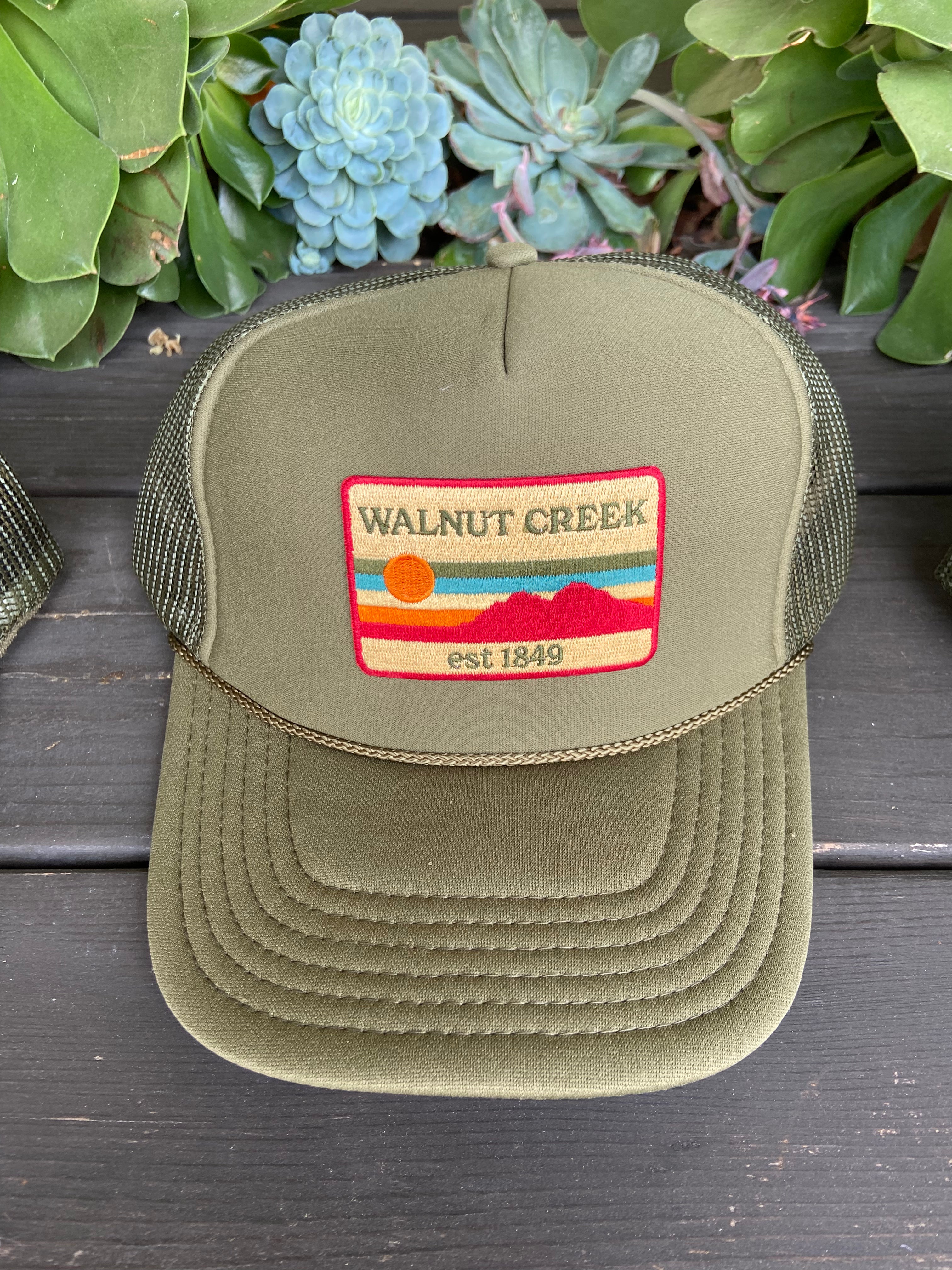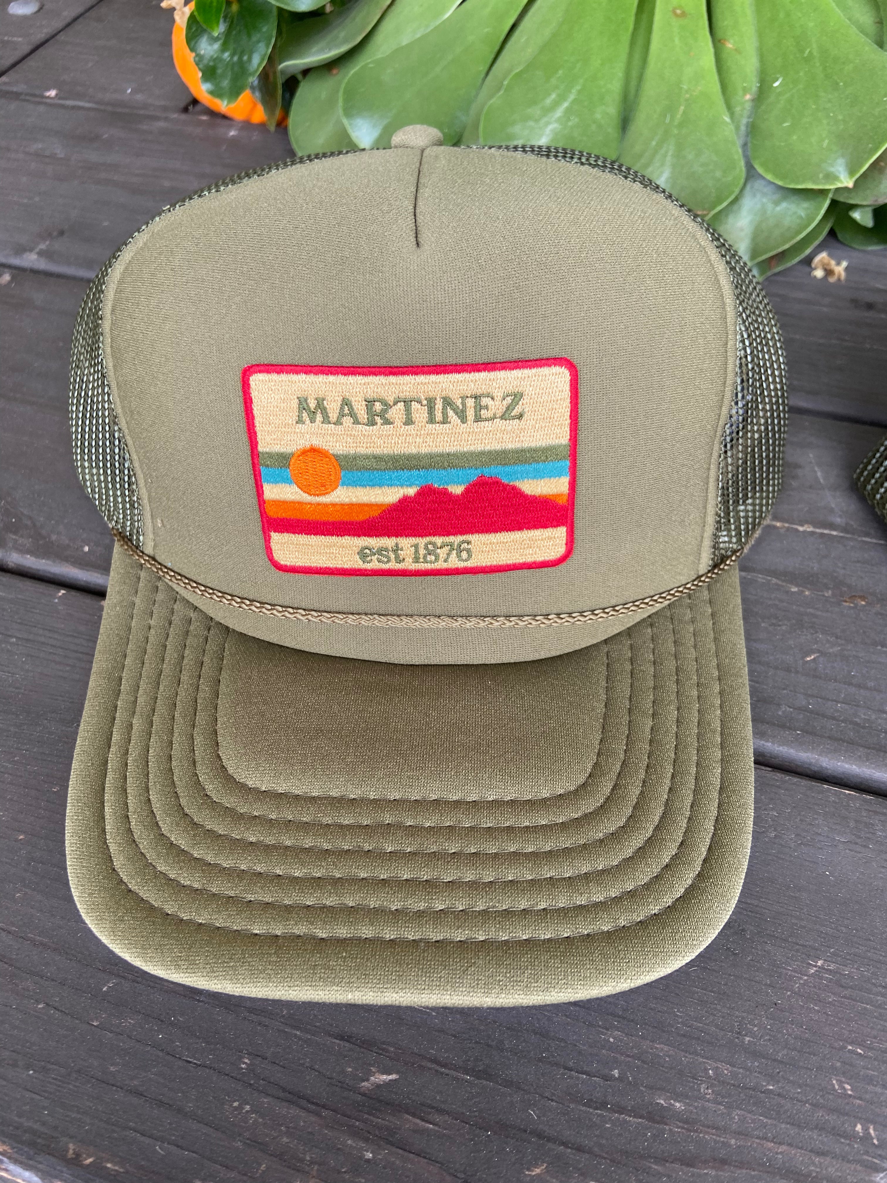 Olive trucker hats with custom embroidery patches, including date city was established.Unisex trucker style, mesh back, SnapBack.
