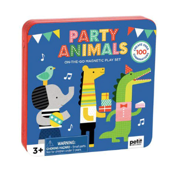Punch out 38 magnetic pieces that can be mixed and matched to create a wild animal party with this adorable set from Petit Collage. Packaged in an easy-close tin, this on-the-go magnetic play set is perfect for travel fun. The tin features two full color play scenes printed on the inside that you can use to display your party animals.