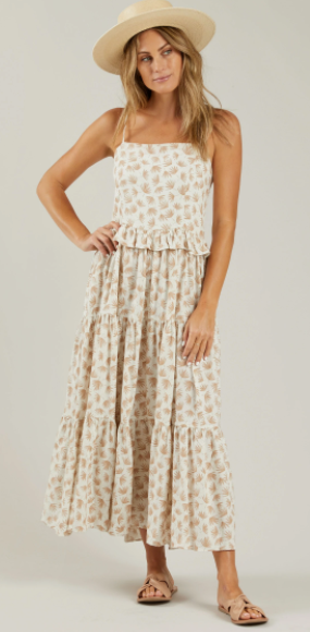 Our new Aubrey Dress has a flowy fit with a ruffle at the waistline, smocking at the back, and adjustable straps. This dress will be your go-to for your summer events!