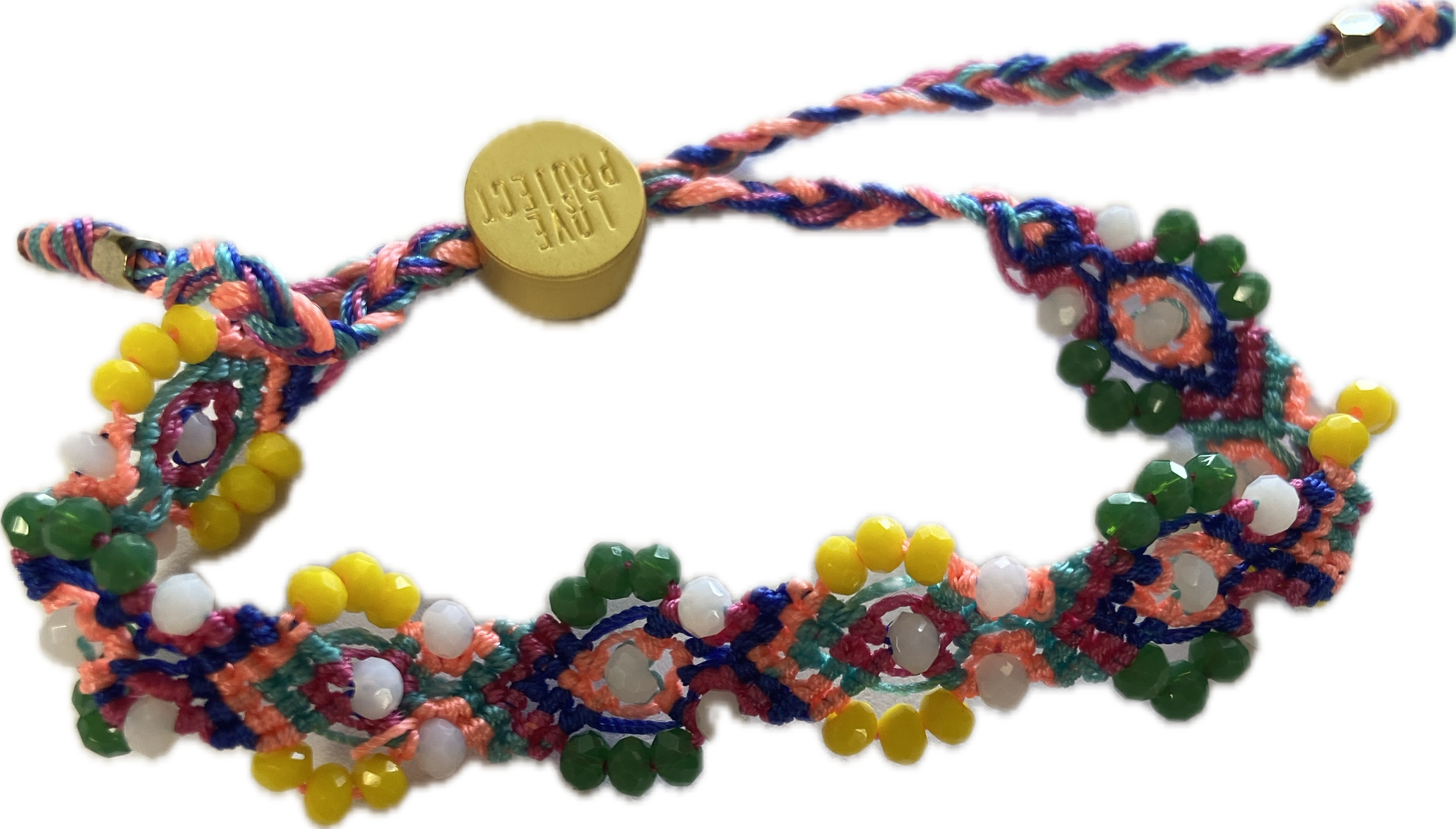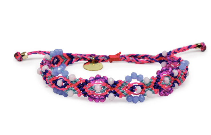 Each adjustable bracelet is expertly woven with vibrant glass beads and colorful threads, evoking the joy and brightness of a garland of flowers.