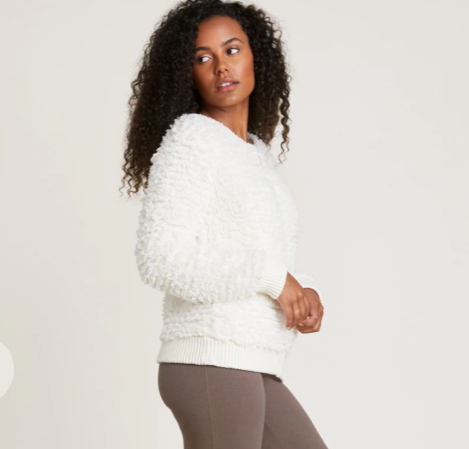 This stylish layering piece is crafted by a loop fringe knitting technique using two different yarn piles for a plush look and feel. Complete with zipper closure and a cotton rib trim at bottom and sleeve openings.