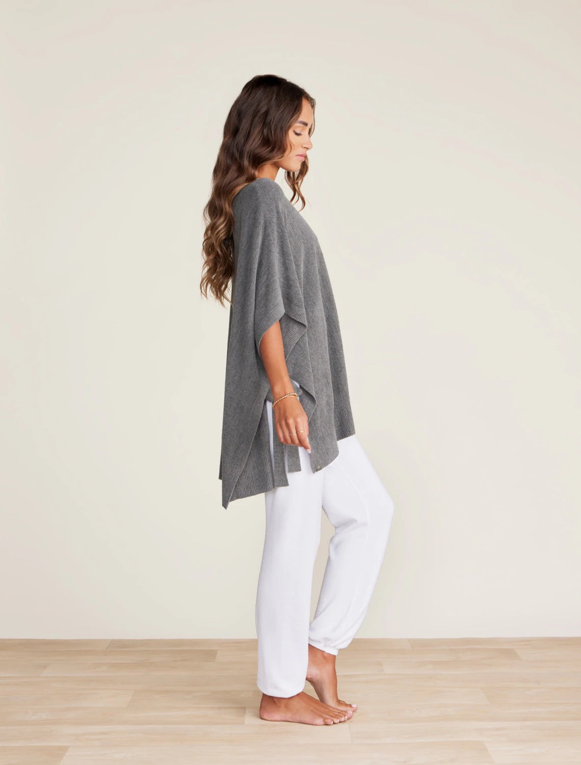 This open crew neck poncho stays secure and looks special thanks to adjustable ties at the sides and a breezy pointelle detail at center front and back. Horizontal rib finishes at the sides, neck, and bottom add interest. Available in two natural hues to wear year round.