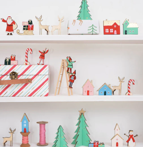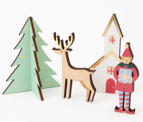 - The trays open to reveal decorative wooden pieces to create a festive scene
