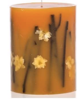 A fragranced wax core is wrapped in a flame retardant barrier and then placed within a larger mold. A skilled artisan then thoughtfully places the natural elements around the core and hand-pours a proprietary blend of wax into the mold. Each botancial work of art takes 2 days to produce. The botanicals are beautifully illuminated when the candle is lit.