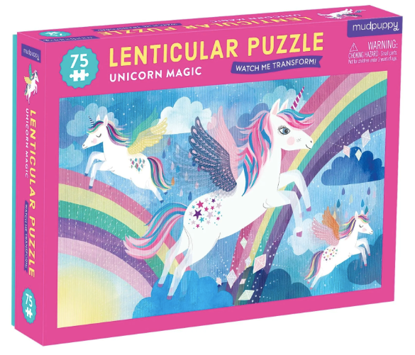 The Unicorn Magic 75 Piece Lenticular Puzzle from Mudpuppy is an exciting and innovative puzzle format that when put together has a wonderful picture that transforms and moves right before your eyes. See magical unicorns soar through the sky! Mudpuppy puzzles are packaged in matte-finish sturdy boxes, perfect for gifting, reuse, and storage.