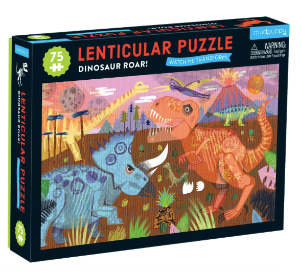 The Dinosaurs Roar! 75 Piece Lenticular Puzzle from Mudpuppy is an exciting and innovative puzzle format that when put together has a wonderful picture that transforms and moves right before your eyes. See dinosaurs transform into their skeletons! Mudpuppy puzzles are packaged in matte-finish sturdy boxes, perfect for gifting, reuse, and storage.