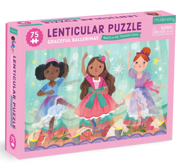 The Graceful Ballerinas 75 Piece Lenticular Puzzle from Mudpuppy is an exciting and innovative puzzle format that when put together has a wonderful picture that transforms and moves right before your eyes. The ballerinas dance like magic! Mudpuppy puzzles are packaged in matte-finish sturdy boxes, perfect for gifting, reuse, and storage.