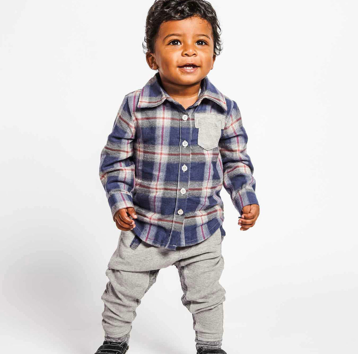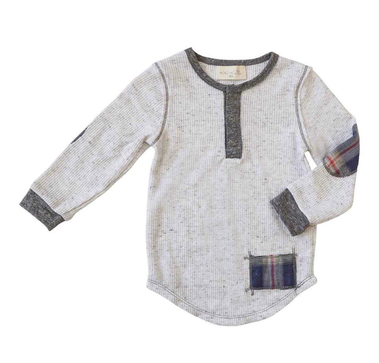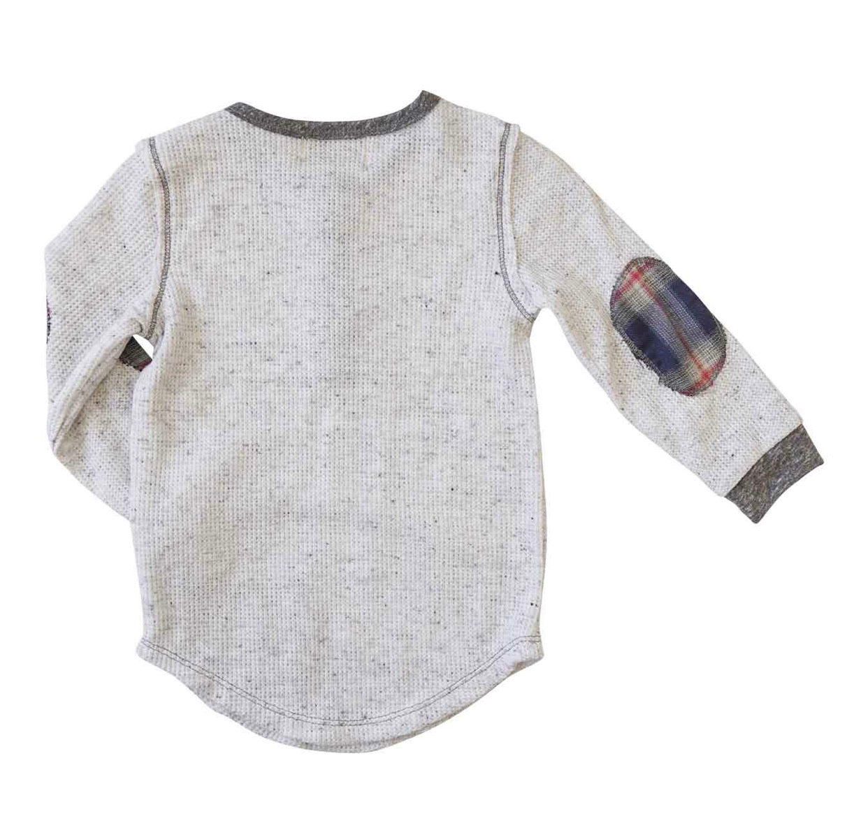 PARKER HENLEY: Made from soft French terry, this long sleeve thermal henley has always been a popular staple every Fall. A perfect piece that goes with everything, it's the best basic with a little touch of plaid for your little one!